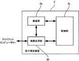 一方、画像処理部2bは、CPU、ROM、RAM、画像処理プロセッサ等が設けられており、図3に示すように、撮像部2aと電気信号ケーブルで接続されている。また、画像処理部2bは、撮像部2aのビデオカメラ29から粒子画像を取り込んで、この粒子画像に対して画像処理を実行するようになっている。この画像処理の結果、粒子画像に含まれる粒子像を含む部分画像が切り出されることとなる。また、画像処理部2bは、電気信号ケーブルを介して制御部2cに接続されている。制御部2cには、CPU、ROM、RAM等が設けられており、当該制御部2cによって粒子測定装置2全体の制御が行われるようになっている。また、画像処理部2bは、電気信号ケーブル5を介してクライアントコンピュータ3に接続されている。  On the other hand, the