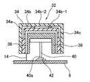 この第3実施形態において、操作ボタン部32は、全体的に円筒形でその円形頂面に模様が付されており、印刷フィルム34、金属箔シートからなる検出電極36、射出成形部材38から構成されている。