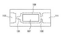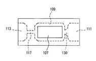 図14は、本実施の形態におけるマイクロポンプの第1の変形例の平面図である。図14を参照して、第1の変形例におけるマイクロポンプ100は、第1流路130の形状が、その幅が加圧室109から第1液室111に向かって大きくなっている。このため、加圧室109から第1液室111に液体が流れる場合の流路抵抗が、第1液室111から加圧室109に液体が流れる場合の流路抵抗よりも小さくなる。この結果、加圧室109を加圧する時間と、減圧する時間とが同じ場合には、液体がマクロには第2液室113から加圧室109を通って第1液室111に向かう方向に流れる。  FIG. 14 is a plan view of a first modification of the micropump in the present embodiment. Referring to FIG. 14, in the