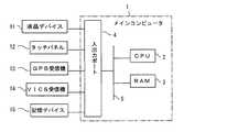 入出力ポート4には、表示手段としての液晶デバイス11と、タッチパネル12と、GPS(Global  Positioning  System)受信機13と、VICS(Vehicle  Information  and  Communication  System)受信機14と、記憶手段、第二の記憶手段、リンク記憶手段および規制情報記憶手段としての記憶デバイス15と、が接続される。  The input /