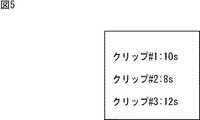 図5のインデックスファイルには、再生順に上からクリップを特定する情報(図5の例では、「クリップ#i」)が記述され、その情報に対応して、各クリップの再生時間が記述されている。図5のインデックスファイルによれば、図6に示すように再生時間が10秒であるクリップ#1、再生時間が8秒であるクリップ#2、再生時間が12秒であるクリップ#3が、図7Aに示すように順に編集結果として再生される。従って、クリップ#1の再生が開始してから18秒後に、クリップ#3の再生が開始される。  In the index file of FIG. 5, information for specifying a clip from the top in the playback order (“clip #i” in the example of FIG. 5) is described, and the playback time of each clip is described corresponding to the information. Yes. According to the index file of FIG. 5, as shown in FIG. 6,