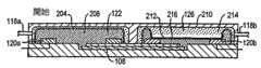 この実施形態では、EKポンプ200は一般に、第1のリザーバ206と第2のリザーバ208を分離する第1の可撓性隔膜204を含む第1のチャンバ202、第3のリザーバ214と第4のリザーバ216を分離する第2の可撓性隔膜212を含む第2のチャンバ210を含む。出口118のどちらかを作用流体の出口、作用流体の入口、及び/または一方の作用流体リザーバへの通気穴とすることができる。好ましくは、(第2のリザーバ208及び第4のリザーバ216内に配設される)ポンプ流体122が作用流体126と混合されないように、可撓性隔膜204及び212は不浸透性である。作用流体(例えば薬物、試薬等)が界面動電流体と適合可能でない場合、作用流体がゼータ電位を支持しない場合、電解電位が低い場合、粘性が高い場合、懸濁された粒子または細胞がある、またはそれを運搬する場合、あるいは作用流体の保存または使用可能寿命を長期間にするためにポンプ流体と分離する必要がある場合、このポンプ構成を使用することができる。ポンプ200では、流体通路は、上側基板と下側基板の間に配設された接合材料内部に封入し(図1に示す)、または1つまたは複数の管の内部に配設することのできる多孔性誘電体材料108を使用して、第2の流体リザーバ208と第4の流体リザーバ216の間に置かれる。電極120a及び120bは多孔性誘電体材料108の内外へ通じる開口を取り囲んでいる。  In this embodiment, the