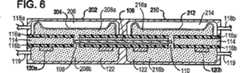 図6はEKポンプからの最大かつ精密な流体送達を確保するために使用することのできる別の手法を示す。貫通穴106及び110は積層基板116a及び116bを通って延び、ポンプ流体リザーバ上部及び下部208a、208b、216a、216bを形成する。この例では、可撓性部材204及び212はリザーバ上部208a及び216aを画成し、収縮の際に可撓性部材204及び212が電極120a及び120bと接触しないように、ポンプ300の電極120a及び120bはリザーバ下部208b及び216b内部に配置されている。当業者には明らかなように、リザーバ208及び214内部の電極のこの配置によって、ポンプの流体体積/容量が増加する。充填ポート119は、ポンプ製造中にリザーバ208a及び208b及びリザーバ216a及び216bをポンプ流体122で満たすために使用され、ポンプ動作中は密封される。  FIG. 6 shows another approach that can be used to ensure maximum and precise fluid delivery from the EK pump. The through