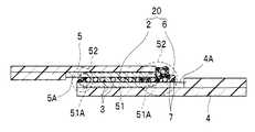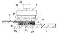 なお、第1の絶縁性接着剤樹脂6は、第2の絶縁性接着剤樹脂2が加圧されるとともに加熱されたときに流動する側、すなわち導電性粒子3の凝集が起きやすい部分に配置されていればよく、第2の絶縁性接着剤樹脂2の全周に配置される必要はない。例えば、第2の絶縁性接着剤樹脂2が図1Aの左右に向かってのみ流動する場合には、その左右両側に配置されていればよい。また、導電性粒子3の凝集が起きやすい部分であっても、ショート不良を発生する可能性が低い又は無い部分には、第1の絶縁性接着剤樹脂6を配置する必要はない。なお、本発明の第1実施形態においては、主にガラス基板4の端部側(図2Bの右側)に向かって第2の絶縁性接着剤樹脂2が流動するものとし、フレキシブル基板5の端部側(図2Bの左側)には、ほとんど第2の絶縁性接着剤樹脂2が流動しないものとして各図を図示している。したがって、ガラス基板4の端部側の縁部51Aに配置される第1の絶縁性接着剤樹脂6は、フレキシブル基板5の端部側の縁部51Aに配置される第1の絶縁性接着剤樹脂6よりも大きく形成している。