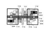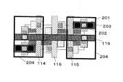従来のビット線2層型横型メモリセルでは、図25のように、第3層目配線によりVSS電源配線120がワード線119と並走していたが、本参考例では、図1に示す様に、VSS電源を上層から下層に通過させる為の接続用島形状パターンのVSSノード201のみとし、上層の第4層目配線によりVSS電源配線204を形成している。  In the conventional bit line two-layer horizontal memory cell, as shown in FIG. 25, the VSS