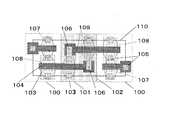 図20に従来のCMOS型SRAMの縦型メモリセルの下層部のレイアウト例を示す。図20において、100はPウェル、101はNウェル、102はウェル境界線、103はソースドレインの拡散層(Pウェル100上ではN型の拡散層、Nウェル101上ではP型の拡散層)、104はゲート電極、105は拡散層103またはゲート電極104と第1層目メタル配線(図示せず)とを接続するコンタクトホール、107はNチャネル型アクセストランジスタ、108はNチャネル型ドライブトランジスタ、109はPチャネル型ロードトランジスタ、110はメモリセル1ビット分のセル境界枠である。  FIG. 20 shows a layout example of a lower layer portion of a conventional CMOS SRAM vertical memory cell. In FIG. 20, 100 is a P well, 101 is an N well, 102 is a well boundary line, 103 is a source / drain diffusion layer (an N type diffusion layer on the