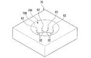 図2に示すように、供給管13の他端部は、ノズル部材70の内部に形成された第1供給流路14の一端部に接続している。一方、ノズル部材70の第1供給流路14の他端部は、ノズル部材70の凹部78の内側面79に形成された第1供給口12に接続されている。ここで、ノズル部材70の内部に形成された第1供給流路14は、複数(2つ)の供給口12(12A、12B)のそれぞれにその他端部を接続可能なように途中から分岐している。また、図2に示すように、第1供給口12に接続された第1供給流路14のうち第1供給口12近傍は、第1供給口12に向かって漸次拡がる傾斜面となっており、供給口12はラッパ状に形成されている。  As shown in FIG. 2, the other end portion of the