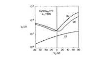 これら二種類の実施例品と一種類の比較品について、ソース・ドレイン電圧(VD)を80Vに設定した時の、ドレイン電流(ID)とゲート電圧(VG)との関係を図3に示す。なお、図3では、縦軸をIDの対数にとって示している。また、図3中において、電圧制御層22として前記化学式(a)に示すものを用いた実施例品は(a)とし、化学式(b)に示すものを用いた実施例品は(b)として記した。また、比較品は(c)として記した。  FIG. 3 shows the relationship between the drain current (ID) and the gate voltage (VG) when the source-drain voltage (VD) is set to 80 V for these two types of example products and one type of comparative product. In FIG. 3, the vertical axis indicates the logarithm of ID. In FIG. 3, the example product using the chemical formula (a) as the
