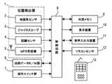 位置検出器1は、いずれも周知の地磁気センサ2、ジャイロスコープ3、距離センサ4、及び衛星からの電波に基づいて車両の位置を測定するGPS(Global Positioning System)のためのGPS受信機5を有している。これらは、各々が性質の異なる誤差を持っているため、複数のセンサにより各々補完しながら使用するように構成されている。すなわち、GPSによる電波航法と、地磁気センサ、ジャイロスコープ3及び距離センサ4による自立航法を組み合わせたハイブリッド航法により、自車位置に関する位置情報が測定される。  The position detector 1 includes a known