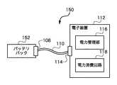 図1Bは本発明の別の実施例の電力供給システム150を示すブロック図である。電力供給システム150は、電源アダプタ102がバッテリパック152に置き換わることを除いて、図1Aに示す電力供給システム100とほぼ同じである。バッテリパック152はDC電力を供給する。周辺ケーブル110は、バッテリパック152から電子装置112にDC電力を供給するために使用される。電子装置112は、周辺ケーブル110によって供給されるDC電力を消費することができる。しかし、図1Aの電源アダプタ102と同様、バッテリパック152は、ある限られた電力を供給するように設計されている。それ故、電子回路112の適正な設計は、バッテリパック152によって利用可能になる、ある限られた電力を電子回路112が大事にすることを、規定すべきだろう。しかし、バッテリパック152の利用可能な電力は、バッテリパック152に設けられたバッテリの種類と数量によって異なる。電力管理装置116は、バッテリパック152の利用可能な電力を過剰消費しないように、電子装置112内の電力消費回路118に作用することができる。それ故、限られた電力が異なる、異なるバッテリパックに接続された場合でも、電子装置112の動作の安定は維持される。電力管理部116は、通常、消費電力がバッテリパック152によって利用可能になる、ある限られた電力を超えないように、例えば、電力消費回路118の様々な回路の使用を、無効にする、制限する、または、順にすることができる。バッテリパック152が未接続の場合に電力を供給するため、あるいは、バッテリパック152が接続されている場合に(必要があれば)補助電力を供給するために、電子装置112内にバッテリを設けることができる。  FIG. 1B is a block diagram showing a