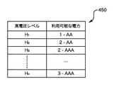 図4Bは高電圧レベルと利用可能な電力の代表的な相関を規定するテーブル450を示す。テーブル450は、電源がバッテリパックの場合の使用に適する。テーブル450は、利用可能な電力の指示を間接的に提供するバッテリパックの特性を示す。図4Bに示すテーブル450が示すように、高電圧レベルH1は、対応するバッテリパックが一つのAAバッテリを有することを示す。高電圧レベルH2は、対応するバッテリパックが二つのAAバッテリを有することを示す。高電圧レベルH3は、対応するバッテリパックが二つのAAAバッテリを有することを示す。さらに、通常、n番目の高電圧レベル(Hn)は、対応するバッテリパックが三つのAAAバッテリを有することを示す。高電圧レベルH1、H22、H3、…、Hnは実装に依存して変わるが、これら電圧レベルはすべて「高い」レベルである。FIG. 4B shows a table 450 defining a typical correlation between high voltage levels and available power. The table 450 is suitable for use when the power source is a battery pack. Table 450 shows the characteristics of the battery pack that indirectly provides an indication of available power. As the table 450 shown in FIG. 4B, the high voltage level H1 indicates that the corresponding battery pack has one AA battery. High voltage level H2 indicates that the corresponding battery pack has two AA batteries. High voltage level H3 indicates that the corresponding battery pack has two AAA batteries. Further, typically, the nth high voltage level (Hn ) indicates that the corresponding battery pack has three AAA batteries. The high voltage levels H1 ,