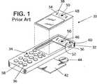 次に図面を参照する。図面では、同様の参照番号は幾つかの図にわたって対応する又は同様の要素を示す。図1は、従来のセルラー電話30を示す。電話30は、前部ハウジング32、前面34、キー・パッド36、ベゼル38、及びベゼル38を受ける凹部領域を備えており、凹部領域は、聴音領域40、表示装置42、トランスデューサ又はスピーカ44を備える。5つの穴46は、前面34及び前部ハウジング32の聴音領域40内に示されている。音は前部ハウジング内の穴を通り、次いでベゼル内の対応した穴を通ってユーザの耳に届く。このシステムは、所望の音色品質及び周波数範囲を生成するように設計されている。図1の電話では、5つの穴46はベゼル38内の5つの穴48と概ね同軸方向に対応し、トランスデューサ44から穴46、48を通る音の直接ポーティングをもたらす。追加の聴音領域40を通る対応するポート52、54、前部ハウジング32の側部を通る側部ポート56、及び後部ハウジング(図示せず)を通る後部ポートも設けることができる。しかし、側部及び後部ポートは、プライバシを低減する傾向があり、対応する穴52、54を通した直接ポーティングにより、穴が耳に非常に近接し、又は耳の密閉領域内にある場合に、過剰に高いSPLがユーザの耳に届く恐れがある。幾つかの従来の電話は、図1で示していないが、追加のトランスデューサ又はブザーも備える。後部ハウジング及びマイクロホンも図1及び図2から省略されているが、マイクロホン用の開口部58が示されている。  Reference is now made to the drawings. In the drawings, like reference numerals indicate corresponding or similar elements throughout the several views. FIG. 1 shows a conventional