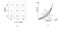 また,入力される映像信号から映像の平均輝度や映像の輝度ヒストグラムを検出する輝度情報検出手段を更に備えてなり,前記映像の輝度情報が,前記輝度情報検出手段によって検出された映像の平均輝度や映像の輝度ヒストグラムであることが考えられる。Further, the apparatus further comprises luminance information detecting means for detecting an average luminance of the video and a luminance histogram of the video from the input video signal, and the luminance information of the video is the average luminance of the video detected by the luminance information detecting means. Or a luminance histogram of the video.