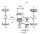 20,120,220 ハイブリッド自動車、22 エンジン、24 エンジン用電子制御ユニット(エンジンECU)、26 クランクシャフト、28 ダンパ、30 動力分配統合機構、31 サンギヤ、32 リングギヤ、32a リングギヤ軸、33 ピニオンギヤ、34 キャリア、35 減速ギヤ、37 ギヤ機構、38 デファレンシャルギヤ、39a〜39d 車輪、40 モータ用電子制御ユニット(モータECU)、41,42 インバータ、43,44 回転位置検出センサ、50 バッテリ、51 温度センサ、52 バッテリ用電子制御ユニット(バッテリECU)、54 電力ライン、54a 正極母線、54b 負極母線、55 昇圧コンバータ、56 システムメインリレー、57,59 平滑コンデンサ、70 ハイブリッド用電子制御ユニット(ハイブリッドECU)、72 CPU、74 ROM、76 RAM、80 イグニッションスイッチ、81 シフトレバー、82 シフトポジションセンサ、83 アクセルペダル、84 アクセルペダルポジションセンサ、85 ブレーキペダル、86 ブレーキペダルストロークセンサ、87 車速センサ、91 第1電圧センサ、92 第2電圧センサ、93 第3電圧センサ、230 対ロータ電動機、232 インナーロータ、234 アウターロータ、D11〜D16,D21〜D26,D31,D32 ダイオード、L リアクトル、MG1,MG2 モータ、T11〜T16,T21〜26,T31,T32 トランジスタ。 20, 120, 220 Hybrid vehicle, 22 engine, 24 engine electronic control unit (engine ECU), 26 crankshaft, 28 damper, 30 power distribution integration mechanism, 31 sun gear, 32 ring gear, 32a ring gear shaft, 33 pinion gear, 34 carrier , 35 reduction gear, 37 gear mechanism, 38 differential gear, 39a-39d wheels, 40 motor electronic control unit (motor ECU), 41, 42 inverter, 43, 44 rotational position detection sensor, 50 battery, 51 temperature sensor, 52 Battery electronic control unit (battery ECU), 54 power line, 54a positive bus, 54b negative bus, 55 boost converter, 56 system main relay, 57, 59 smoothing capacitor, 70 hybrid Electronic control unit (hybrid ECU), 72 CPU, 74 ROM, 76 RAM, 80 ignition switch, 81 shift lever, 82 shift position sensor, 83 accelerator pedal, 84 accelerator pedal position sensor, 85 brake pedal, 86 brake pedal stroke sensor , 87 vehicle speed sensor, 91 first voltage sensor, 92 second voltage sensor, 93 third voltage sensor, 230 to rotor motor, 232 inner rotor, 234 outer rotor, D11 to D16, D21 to D26, D31, D32 diode, L Reactor, MG1, MG2 motor, T11-T16, T21-26, T31, T32 transistors.