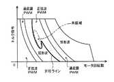 図5に制御方式設定用マップの一例を示す。同図は、制御方式設定用マップのトルク指令およびモータ回転数の値が共に正となる領域(第1象限)を例示するものであり、図5からわかるように、制御方式設定用マップは、上述の目標昇圧後電圧設定用マップに対応付けられると共にモータMG1,MG2の動作領域を正弦波PWM制御方式が用いられる領域と過変調PWM制御方式が用いられる領域と矩形波制御方式が用いられる領域とに区分けするように作成されている。また、実施例では、上記昇圧ラインにより規定される非昇圧領域と昇圧領域との双方が、基本的にモータ回転数が低い側から順番に、正弦波PWM制御方式が用いられる領域と過変調PWM制御方式が用いられる領域と矩形波制御方式が用いられる領域とにそれぞれ区分けされている。すなわち、実施例のハイブリッド自動車20では、昇圧コンバータ55によりバッテリ50側の昇圧前電圧VLが昇圧されていない状態と昇圧されている状態との双方のもとで正弦波PWM制御方式と過変調PWM制御方式と矩形波制御方式とを選択的に用いてモータMG1,MG2がトルク指令Tm1*,Tm2*に基づくトルクを出力するようにインバータ41,42が制御されるのである。これにより、一般に昇圧コンバータ55によりバッテリ50側の昇圧前電圧VLが昇圧されるときにのみ用いられる矩形波制御方式の適用範囲を昇圧コンバータ55によってバッテリ50側の昇圧前電圧VLが昇圧されないときにまで拡げることにより、昇圧コンバータ55にバッテリ50側の昇圧前電圧VLを昇圧させる機会を減らしてもモータMG1,MG2の出力を確保することが可能となり、モータMG1,MG2の駆動制御に伴うエネルギ効率をより向上させることができる。更に、実施例の制御方式設定用マップは、図5に示すように昇圧コンバータ55で共振が発生するときのモータMG1またはMG2の動作点を含む領域である共振域での制御方式が正弦波PWM制御方式となると共に、モータMG1およびMG2の一方の目標動作点が共振域に含まれるときのモータMG1およびMG2の他方の目標動作点が含まれる領域での制御方式が正弦波PWM制御方式となるように作成されている。  FIG. 5 shows an example of the control method setting map. This figure exemplifies a region (first quadrant) in which both the torque command and the motor rotation speed value of the control method setting map are positive. As can be seen from FIG. Corresponding to the above-described target post-boost voltage setting map, the operation areas of the motors MG1 and MG2 are the area where the sine wave PWM control method is used, the area where the overmodulation PWM control method is used, and the area where the rectangular wave control method is used. It is created to be divided into and. In the embodiment, both the non-boosting region and the boosting region defined by the boosting line are basically the same as the region in which the sine wave PWM control method is used, and the overmodulation PWM in order from the low motor rotation speed. The area is divided into an area where the control method is used and an area where the rectangular wave control method is used. That is, in the