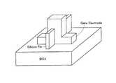 これらの問題を解決するために、絶縁膜上に形成した結晶シリコン(Silicon-On-Insulator;SOI)基板に製造されたMOSFETが開発されている。SOIは、接合寄生容量と漏電流とを減少できる。さらに上記問題を解決するために、ダブルゲートMOSFETが開発されており、その実用的な実施形態の1つは、非特許文献1、および非特許文献2に記載のようなFIN−FETである。これらFIN−FETは、SOI基板に形成されており、図9に記載のように、チャネル領域部となる本体の厚みが非常に薄いので、完全空乏化モード(Fully-Depleted mode)で作動する。  In order to solve these problems, MOSFETs manufactured on a crystalline silicon (Silicon-On-Insulator; SOI) substrate formed on an insulating film have been developed. SOI can reduce junction parasitic capacitance and leakage current. Further, in order to solve the above problem, a double gate MOSFET has been developed. One practical embodiment is a FIN-FET as described in