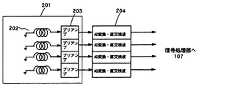 各小型RFコイル202は、それぞれプリアンプ203に接続されており、各コイルからの出力はプリアンプ203でそれぞれ増幅される。各プリアンプ203はそれぞれAD変換・直交検波回路204に並列に接続され、信号検出部106を構成する。AD変換直交検波器204で検波された信号は、各コイル毎のフーリエ変換、フィルタリング、合成演算などを行うために信号処理部107に送られる。信号処理部107で行う処理は、予めプログラムとして組込まれている。  Each