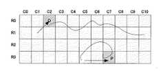 (7)今、前フレームの内容が図6のようになっており、現フレームの内容が図7のようになっている場合、図6における(C1,R1)の領域Oと一致するパターンを図7の(C0,R0)から順に確認していくと、(C2,R0)で適合が確認される(S105)。(7) Now, if the contents of the previous frame are as shown in FIG. 6 and the contents of the current frame are as shown in FIG. 7, the pattern that matches the area O of (C1, R1) in FIG. When checking sequentially from (C0, R0) in FIG. 7, conformity is confirmed at (C2, R0) (S105).