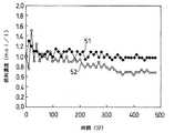 以上の実施例1および比較例1の燃料電池システムについて、希釈タンクの燃料濃度の経時変化を計測した結果を図5に示す。図中、51は、本発明の実施例における濃度の経過時変化を示し、52は、比較例における濃度の経時変化を示す。なお、図中の比較例における濃度変化とは、濃度計の測定値ではなく、ガスクロマトグラフにより測定した値である。発電は、セル温度が60℃になるようにコントロールした状態で、電流密度にして100mA/cm2の電流を流した。希釈タンクの濃度の設定値は1mol/lとし、初期値は設定値と同一にした。計測は10分毎に行い、8時間運転した。FIG. 5 shows the results of measuring the change over time in the fuel concentration of the dilution tank for the fuel cell systems of Example 1 and Comparative Example 1 described above. In the figure, 51 indicates the change with time of concentration in the example of the present invention, and 52 indicates the change with time of concentration in the comparative example. The concentration change in the comparative example in the figure is not a measurement value of a densitometer but a value measured by a gas chromatograph. In the power generation, a current of 100 mA / cm2 was passed as the current density in a state where the cell temperature was controlled to 60 ° C. The set value of the concentration in the dilution tank was 1 mol / l, and the initial value was the same as the set value. The measurement was performed every 10 minutes and operated for 8 hours.