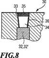 図6は、内部容器2の代わりに用いることができる内部容器30を示す。内部容器30は円筒状に形成され、その中心に円筒状の冷却チャンバ31を有する。この冷却チャンバ31は、内部容器30の上面から延びており、壁面の距離を置いて環状の冷却剤チャンバ32によって取り囲まれている。この冷却剤チャンバ32は、内部容器30の上端面及び下端面から壁面の距離を置いた範囲で止まっている。この場合も、冷却剤チャンバ32には冷却剤32'を充填する。冷却剤を注入するため、内部容器30の上端面に、冷却剤チャンバ32の方に向かって円錐状に僅かにテーパした充填開口33を形成する。この詳細が図8に示されている。冷却剤32'注入後、充填開口33を、同じく高級鋼又はチタン製のストッパ34によって閉止する。ストッパ34の上部で、充填開口33を溶接ビード35によって溶接閉止する。  FIG. 6 shows an