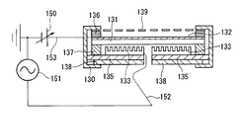 また、上電極132は、リード153が接続されており、このリード153は直流バイアス電源150に接続されている。この直流バイアス電源150により上電極132には50〜150V程度の上電極吸着用の直流バイアス電圧が常時、印加され上電極132が下電極133側に吸着されるようになっている。151は信号源である。  The