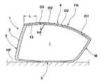 クラウンカバー部材FRは、種々の方法で製造される。例えばプリプレグの複数枚を積層しこれに熱と圧力とを作用させて所定の形状に硬化させることができる。プリプレグは、前記繊維を未硬化ないし半硬化状態のマトリックス樹脂に含浸させたシート体である。好ましくは繊維を一定の方向に配向した一方向プリプレグの複数枚が、前記繊維を交差する向きに重ねられて用いられるのが望ましい。また、その最外層には、少なくとも1枚のクロスプリプレグを含ませるのが望ましい。クロスプリプレグは、少なくとも2つの交差する向きにのびる織成された繊維を含む。このようなクロスプリプレグは、成形時の繊維のばらけを防止しかつ均一な伸びが得られやすい点で好ましい。クラウンカバー部材FRの軽量化と強度との観点より、プリプレグの層数は、好ましくは3〜10枚、より好ましくは3〜8枚、さらに好ましくは3〜5枚が望ましい。 The crown cover member FR is manufactured by various methods. For example, a plurality of prepregs can be laminated and heat and pressure can be applied to the prepreg and cured into a predetermined shape. A prepreg is a sheet body in which the fibers are impregnated with an uncured or semi-cured matrix resin. Preferably, it is desirable that a plurality of unidirectional prepregs in which fibers are oriented in a certain direction are used by being stacked in a direction crossing the fibers. Moreover, it is desirable that the outermost layer includes at least one cross prepreg. The cross prepreg includes woven fibers extending in at least two intersecting directions. Such a cross prepreg is preferable in that it prevents the fibers from being scattered during molding and can easily obtain uniform elongation. From the viewpoint of weight reduction and strength of the crown cover member FR, the number of prepreg layers is preferably 3 to 10, more preferably 3 to 8, and further preferably 3 to 5.