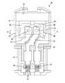ハウジング40の後面には、図3及び図6に示すように、端子収容部41の上縁に沿って、コイル30が収容されるコイル収容凹部54が形成されているとともに、端子収容部41の下部側から電線収容部42の上部側にわたり、第1端子金具21Aと第2端子金具21Bのリード部25A,25Bと、第3端子金具21Cとを収容する端子収容溝55が形成されている。