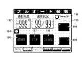 タッチパネル60に表示された操作メニュー画面(図12参照)においてフルオートボタン128に指が触れると、システム制御装置50は、タッチパネル60に、図19に示すようなフルオート撮影画面を表示する。フルオート撮影画面には、一時停止中のときに点滅表示する一時停止中ランプ191と、現在撮影中の撮影角度θを表示する撮影角度フィールド192と、現在撮影中のステップ数/ターンテーブル分割数(水平分割数)を入力する撮影ステップ/水平分割数フィールド193と、ロボット動作中(ボタン入力不可)を赤で示し、ボタン入力可を緑で示す動作中モニタランプ194と、カメラ制御用接点をONするカメラ制御ONボタン195と、オート撮影スタートボタン196と、オート撮影一時停止ボタン197と、オート被写体撮影を中止して原点に移動させるオート撮影中止ボタン198と、水平撮影毎一時停止ボタン199とが設けられている。  When the finger touches the