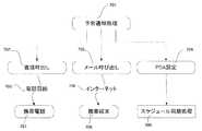 図3は、図2の予告通知処理以降の、3パターンの動作を説明した機能ブロック図であり、702の直接呼び出しの場合は、電話回線705を介してユーザの持つ携帯電話707などに直接通知されるものである。また、703のメール呼び出しの場合には、電話回線や無線回線、あるいはCATVなどを介して、インターネットに接続し、チャットシステム、電子メールプロトコルによりユーザの持つ携帯端末などに通知するものである。また、704のPDA設定の場合には、予め、PDAと通信及び同期の出来るリンクが用意されている場合に、PDAのアラーム付きスケジュール機能を設定する為のファイルを作成し、PDAがDTV装置とアラーム付きスケジュール機能の同期処理を行い、DTV装置が予告通知を行おうとする時間にPDAのスケジューラにより通知を行うものである。