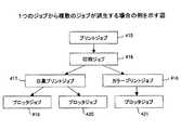 次に、図9を用いて、1つのジョブから複数のジョブが派生するパターンについて説明する。図9には、1つのプリントジョブ415から1つの印刷ジョブ416が派生し、その印刷ジョブ416から白黒プリントジョブ417、カラープリントジョブ418という2つのジョブが派生している。さらに白黒プリントジョブ417からは2つのプロッタジョブ419、420が派生している。また、カラープリントジョブ418からプロッタジョブ421が派生している。  Next, a pattern in which a plurality of jobs are derived from one job will be described with reference to FIG. In FIG. 9, one