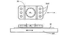 図4は、局在化液体供給システムによるもう1つの浸漬リソグラフィ解決方法を示す。液体は、投影システムPLのどちらかの側上の2つの溝入口INを通して供給され、入口INの外側に半径方向に配置されている複数の個々の出口OUTを通して除去される。入り口INおよび出口OUTは、その中央に孔部を有し、投影ビームが投影される1つの平面内に配置することができる。液体は投影システムPLの一方の側上の1つの溝入口INを通して供給され、投影システムPLの他方の側上の複数の個々の出口OUTを通して除去され、投影システムPLと基板Wとの間に液体の薄いフィルムの流れを形成する。入口INおよび出口OUTを使用するための組合わせの選択は、基板Wの運動方向により異なる(入口INおよび出口OUTの他の組合わせは作動しない)。 FIG. 4 shows another immersion lithography solution with a localized liquid supply system. Liquid is supplied through two groove inlets IN on either side of the projection system PL and removed through a plurality of individual outlets OUT arranged radially outside the inlet IN. The inlet IN and the outlet OUT have a hole in the center thereof, and can be arranged in one plane on which the projection beam is projected. Liquid is supplied through one groove inlet IN on one side of the projection system PL, removed through a plurality of individual outlets OUT on the other side of the projection system PL, and liquid between the projection system PL and the substrate W. Form a thin film stream. The choice of combination for using the inlet IN and outlet OUT depends on the direction of motion of the substrate W (other combinations of inlet IN and outlet OUT do not work).