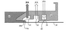 図10および図11に示す変形例の場合には、鋭角のコーナー35は、鋭角のコーナーのところの表面張力により保持されるメニスカス11aの位置を制限するために使用される。鋭角のコーナーは、図10に示すように鈍角であってもよいし、図11に示すように直角であってもよい。ガス抽出リング32の形は必要に応じて調整することができる。  In the case of the variant shown in FIGS. 10 and 11, the