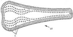 本明細書における更に好ましい実施形態では、孔あきトップシートは不織布外側層(不織布層は着用者の表面を向く)と合わせて、孔あきポリマーフィルム、好ましくは孔あき成形フィルムを含む。一般に不織布層は、少なくとも液体が吸収性物品の上に排出されると思われる領域には、不織布層がないように不連続な方法で孔あきポリマーフィルムの上に配置される。実際に、着用者に接触する表面に孔あきポリマーフイルムが長手方向の中心に設けられているが、中心以外の領域には、例えば、不織布が皮膚と特に親和性であるハイロフト型の不織布又は他の不織布のような不織布が配置される、いわゆるハイブリッド型トップシートであることが好ましい。このようなトップシートは、欧州特許出願第523683号、欧州特許出願523719号、欧州特許出願612233号、又は欧州特許出願766953号に開示されている。図1は、不織布外側層2及び孔あきポリマー成形フィルム層3(孔は図示されない)を含むそのような好ましいトップシートを持つパンティーライナ1を説明している。不織布外側層2は吸収性物品の着用者に面する表面の中央領域に位置する開口部20を持つ。開口部20は身体の排出物のための通路として不織布外側層2に提供され、孔あき成形フィルム層3の上に直接配置されてその優れた流体処理特性を利用するので、流体は迅速に吸収性コアの中まで通過する。一般に不織布外側層2は、ストリップ21、22間の間隔を置く領域が開口部20を形成するように、孔あき成形層3の最上部で空間を置く二つのストリップ21、22を含む。これら二つの層は連続的、部分的又は断続的に固着されることができる。好ましい実施形態では、不織布外側層及び孔あき成形フィルム層はストリップ21と22の複数の位置でヒートボンド23でスポット固着される。ヒートボンド23はエンボス加工された密閉模様を提供し、例えば波線のようなその模様の意匠において審美的効果も与えることができる。