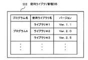 図6は、使用ライブラリ管理DBのデータ構造例を示す図である。使用ライブラリ管理DB111には、プログラム名、使用ライブラリ名、およびバージョンの欄が設けられている。  FIG. 6 is a diagram illustrating an example of the data structure of the used library management DB. The used