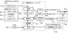 ユーザが正しく認証されたら、ユーザ認証モジュール157はユーザPC11の起動に係る処理を続行する。ユーザ認証モジュール157は、暗号化データ31を復号化して獲得したPOP201をシステムBIOS151に入力し(ブロック515)、HDP203をHDD123に入力し(ブロック517)、その他のパスワード205をSMRAM171に記憶する(ブロック519)。POP201およびHDP203が正しいことがシステムBIOS151およびHDD123によって確認されれば、システムBIOS151はBIOSフラッシュROM131に格納されたPOST155を起動してハードウェアのテストを行い、セキュアNVRAM133を読み書き禁止にし、INT13Hハンドラ160を呼び出すことによりHDD123を起動してOSの起動を開始する(ブロック521)。以上でBIOS段階でのユーザ認証の処理を終了する(ブロック523)。ブロック513で、復号化されたシリアル・ナンバ219がUSBフラッシュ・メモリ127から読み取られたシリアル・ナンバ219と等しくなければ、ユーザ認証モジュール157はOSを起動しないでユーザ認証の処理を打ち切って終了する(ブロック525)。なお、パスワード管理ユーティリティ251は、ユーザ認証が正常に完了してOSが立ち上がった後にOS上で動作し、SMRAM171に記憶されたその他のパスワード205を受け取って認証作業を行う周知のソフトウェアであるが、詳細は後述する。  If the user is correctly authenticated, the