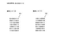 また、記録用紙等の媒体に符号化された地紋画像が出力された場合、復号の起点が不明となる。このような場合であっても、符号化パターンP1、P2を走査し、当該符号化パターンP1、P2との相関性が高いところを検出すれば復号化が可能である。すなわち、M系列符号の高自己相関性という特性によって、地紋画像に当てはめられた符号化パターンP1、P2と同期をとることができ、そのあてはめ位置を正確に認識することが可能となる。よって、復号のために起点を示すマーカーを設ける等の前処理をすることなく、復号が容易となる。 In addition, when an encoded tint block image is output on a medium such as a recording sheet, the starting point of decoding becomes unknown. Even in such a case, decoding is possible by scanning the coding patterns P1 and P2 and detecting a place having high correlation with the coding patterns P1 and P2. That is, due to the high autocorrelation property of the M-sequence code, it is possible to synchronize with the coding patterns P1 and P2 applied to the copy-forgery-inhibited pattern image, and it is possible to accurately recognize the fitting position. Therefore, decoding is facilitated without preprocessing such as providing a marker indicating the starting point for decoding.