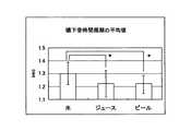 次に、図13は振動ピックアップから得られる嚥下音時間周期(図10におけるピークが現れる周期)の平均値を調べた結果である。水とジュース、水とビールとの間に有意差が認められ、水をゴクゴク飲む時よりもジュース、ビールを飲む時の方が嚥下音時間周期が短くなることが確認された。つまり、水よりもビール、ジュースを飲む時の方が「ゴクゴク」と音がよく鳴ることが示唆された。 Next, FIG. 13 shows the result of examining the average value of the swallowing sound time period (period in which the peak in FIG. 10 appears) obtained from the vibration pickup. Significant differences were observed between water and juice, and water and beer, and it was confirmed that the swallowing sound period was shorter when drinking juice and beer than when drinking water. In other words, it was suggested that the sound of “gokugoku” sounds better when drinking beer and juice than water.