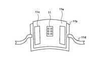 圧力センサ11は図2に示すように、左右で対となるセンサを縦方向(上下方向)に3対、計6個のセンサをウレタンホーム11aに固定し、これをレジン基部11bに取り付けたものである。ウレタンホーム11aにはこれを首に装着するときに固定できるように両面テープ11cを貼り付けている。また、レジン基部11bにはバンド11dが取り付けられており、これを用いてセンサが前頸部に位置するように頸部に装着する。  As shown in FIG. 2, the