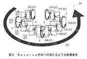 また図8に示すように、各映像表示部57(57F〜57A〜57V)に表示される再生映像としては、再生速度−vと設定された場合、逆戻り方法に可変速表示され、また再生時間差ΔT分が変更されることに応じて任意の時間間隔で時間差表示されることになるため、全体としては太矢印ST2に示すリバース方向へ流れるように可変速表示された常態で連動表示される。 Also, as shown in FIG. 8, the playback video displayed on each video display unit 57 (57F to 57A to 57V) is displayed in variable speed in the reverse method when the playback speed is set to -v, and the playback time difference Since the time difference is displayed at an arbitrary time interval in accordance with the change of ΔT, the entire display is interlocked and displayed in a normal state in which the variable speed is displayed so as to flow in the reverse direction indicated by the thick arrow ST2.