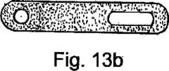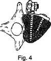 好ましい方法の実施では、脊椎プレートは、1対の同じような上下椎骨ステープルを介して少なくとも2つの椎骨を連結する長方形とすることができ、それは第1および第2の端部を有する。第1の端部は第1の穴を有し、第2の端部は細長いu字形溝穴を有する。このプレートはまた、下側表面(ねじに面する側)および上側表面(ワッシャーに面する側)を含む。下側表面で、第1の穴は、脊椎プレートが様々な角度配置で海綿質ねじに取り付き得るように、穴の回りに径方向へ延びる複数の細歯を画成する。上側表面で、細長いu字形溝穴は、脊椎プレートが矩形の細歯付きワッシャーを介して、隣接する骨ねじと適合するために可変位置で配置可能であるように複数の平行な細歯を画定する。このプレートを使用して、1対の同じような上下椎骨ステープルを器具使用区間の両端の椎骨に装着することができる。これらの椎骨ステープルは、後方穴および前方穴を有する。後方穴は前方ロッド式システムのねじを受け入れ、前方穴は脊椎プレートを固定するための海綿質ねじを受け入れる。椎骨ステープルは楔形であり、脊椎ねじによって1対の金属製の緊張ケーブルを椎骨に固定することが可能である。ステープルは3つの突出部を含むことが好ましい。1対の実質的に平行な、垂直にオフセットした薄板後方足部が、椎骨終板の中に挿入され、該後方足部の間の平行距離は、椎骨の両側を覆ってぴったりとフィットするようになっている。第3の突出部は、大動脈および胸/腹部器官の損傷を回避するためにステープルの中心部に配置される。ステープルは1対の脊椎ねじ受け穴をさらに具備し得る。後方穴は2つの後方ステープル足部間の中間部分に配置され、この穴は脊椎ねじを安全に中間部分に位置決めする。前方穴はステープルの前方部分の中心に向かって傾斜する。前方穴は、大動脈の損傷および椎体前縁の破損を回避するように、適切な梃子作用で幾何学的に前方ねじを後方に向けさせる。後方穴は、脊髄の損傷を回避するように、後方椎骨ねじを前方に向けさせる。2穴設計は、2本のねじとステープルとの間で椎骨中に安定性のある3角形ねじ構造を設ける。ステープルは、それが解剖学的に最適に取り付けられ、前/後方向の構造輪郭を最小にするために椎骨の解剖学的構造に一致するように、形状が僅かに凸である、一体の実質的に中実で楔形の薄板架橋部分をさらに含む。上/下方向の部分は、終板突起を回避しかつプレートが骨に密着するように、2つの後方足部よりも幅が狭い。 In a preferred method implementation, the spinal plate can be rectangular that connects at least two vertebrae via a pair of similar upper and lower vertebral staples, which have first and second ends. The first end has a first hole and the second end has an elongated u-shaped slot. The plate also includes a lower surface (side facing the screw) and an upper surface (side facing the washer). On the lower surface, the first hole defines a plurality of fine teeth that extend radially around the hole so that the spinal plate can attach to the cancellous screw in various angular arrangements. On the upper surface, the elongated u-shaped slot defines a plurality of parallel fine teeth so that the spinal plate can be placed in variable positions to fit adjacent bone screws via rectangular fine tooth washers To do. Using this plate, a pair of similar upper and lower vertebral staples can be attached to the vertebrae at both ends of the instrument use section. These vertebral staples have a posterior hole and an anterior hole. The posterior hole accepts an anterior rod system screw and the anterior hole accepts a cancellous screw for securing the spinal plate. Vertebral staples are wedge shaped and a pair of metal tension cables can be secured to the vertebrae by spinal screws. The staple preferably includes three protrusions. A pair of substantially parallel, vertically offset lamellar posterior feet are inserted into the vertebral endplate so that the parallel distance between the posterior feet fits snugly on both sides of the vertebra. It has become. The third protrusion is placed in the center of the staple to avoid damage to the aorta and thoracic / abdominal organs. The staple may further comprise a pair of spinal screw receiving holes. The posterior hole is located in the middle part between the two posterior staple legs, and this hole safely positions the spinal screw in the middle part. The forward hole is inclined toward the center of the forward portion of the staple. The anterior hole geometrically directs the anterior screw backwards with appropriate lever action to avoid aortic damage and vertebral anterior rupture. The posterior hole directs the posterior vertebral screw forward so as to avoid spinal cord damage. The two-hole design provides a stable triangular screw structure in the vertebra between the two screws and staples. The staple is a unitary substance that is slightly convex in shape so that it is optimally anatomically attached and conforms to the vertebral anatomy to minimize anterior / posterior structural contours It further includes a solid, wedge-shaped thin plate bridging portion. The upper / lower portion is narrower than the two posterior feet so as to avoid endplate protrusions and to keep the plate in close contact with the bone.