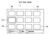 本実施形態に係る画像一覧画面W40においては、ユーザは、OKボタンB18を押下すると、この画像一覧画面W40を次のページに進めることができる。また、カーソルボタンB10、B12、B14、B16を操作して、カーソルCRを目的の画像IMに移動し、プラスボタンB22を押下すると、目的の画像IMを選択することができ、逆に、カーソルCRを誤って選択してしまった画像IMに移動し、マイナスボタンB24を押下すると、その画像IMの選択を解除することができる。 In the image list screen W40 according to the present embodiment, when the user presses the OK button B18, the image list screen W40 can be advanced to the next page. Further, by operating the cursor buttons B10, B12, B14, and B16 to move the cursor CR to the target image IM and pressing the plus button B22, the target image IM can be selected. Is moved to the image IM that has been selected by mistake and the minus button B24 is pressed, the selection of the image IM can be released.