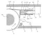 また、ブラシ3を強く時計回りに回転しようとすると、ブラシ3の逆目方向の毛がストッパ部21bの端面を押圧し、その押圧力がゴミかき取り金具21を押圧するコイルバネ16の付勢力より勝ると、ゴミかき取り金具21が可動筒15と一緒に図10中のコイルバネ16の付勢方向とは反対方向に移動することにより、ゴミかき取り金具11のゴミかき取り部21aがブラシ3から離れるように移動し、ゴミかき取り部11aとブラシ3との間に小さな隙間ができる。Next, when the