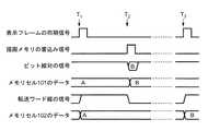 次に、図3のタイミングT3において、表示フレームの同期信号が活性レベルになると、不活性レベルの転送ワード線は活性レベルへ変化し、ダイナミック表示メモリのメモリセル102が、Bをスルー出力する。このタイミングT3の動作は、表示フレームの同期信号の不活性レベル期間の全ての書込みワードアドレスのダイナミック表示メモリのメモリセル102で同時に行われる。  Next, at the timing T3 in FIG. 3, when the synchronization signal of the display frame becomes the active level, the transfer word line at the inactive level changes to the active level, and the