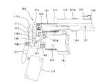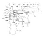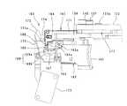また本実施の形態においては、トリガ141の引き操作方向とカムブロック171の動作方向とを同方向に定めている。このことにより、当該トリガ141の引き操作に対するカムブロック171の連動システムを構築する際の設計が楽になる。またトリガ141とカムブロック171との連動あるいは連動解除を、回動動作するスイングアーム164によって行う構成である。このため、スイングアーム164は、軸と孔との嵌め合いによる構成となり、加工精度が出し易く、円滑な動作を得ることができる。またスイングアーム164が連動解除位置から連動位置へ復帰する際の動作につき、第2トーションスプリング166の撓みを利用することによってスイングアーム164をカムブロック171に干渉させつつ合理的に連動位置へと復帰することを可能としている。  In the present embodiment, the pulling operation direction of the