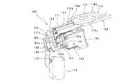 またスイングアーム164には、第2トーションスプリング166が設けられ(図31および図32参照)、トリガ141には、第3トーションスプリング167が設けられている。第2トーションスプリング166は、本発明における「弾性部材」および「第2のバネ部材」に対応し、第3トーションスプリング167は、本発明における「第1のバネ部材」に対応する。第2トーションスプリング166は、一方の足166aがスイングアーム164に係止され、他方の足166bが自由状態となっており、当該自由側の足166bを支軸163a回りに回動動作させたとき、当該第2トーションスプリング166を介してスイングアーム164が回動される構成とされる。なお2トーションスプリング166の自由側の足166bは、その先端部が約90度折り曲げられている。第3トーションスプリング167は、一方の足167aがトリガ141に係止され、他方の足167bが第2トーションスプリング166の自由側の足166b(折り曲げ部)に係止されている。これにより、第3トーションスプリング167の付勢力は、常時に第2トーションスプリング166を介してスイングアーム164を連動位置から連動解除位置へと回動させる方向に付与され、この付勢力は前述したガイドプレート168によって受けられる。  The