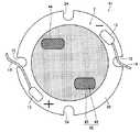 本発明の発光装置は、通常、上述した用途に供するために、相手部材に取り付け、固定するための固定用穴を有する。図1および図4に示した正方形状の上面形状を有する発光装置1,21では、正方形状の上面形状を有する絶縁基板3の対向する角部に、絶縁基板3を貫通するように設けられた固定用穴11が対角線上に配置されて1つずつ形成された場合を示している。また、図5〜図7に示した円形状の上面形状を有する発光装置31,41,51では、切り欠き状の固定用穴34が、円形状の上面形状を有する絶縁基板32の中心を通る直線上に配置されて1つずつ形成された例を示している。The light-emitting device of the present invention usually has a fixing hole for attaching and fixing to a counterpart member in order to provide the above-described use. In the