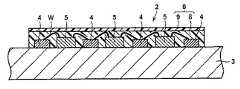 本発明の発光装置はまた、配線パターンが、発光素子との間の電気的接続の位置決め用のパターン、または、発光素子の搭載位置の目安用のパターンをさらに有することが、好ましい。図3には、平行に形成された4つの直線状の配線パターン4に繋がって、パターン7が点在して形成された例を示している。このパターン7を、配線パターン4と発光素子5との間の電気的接続の位置決め、または、発光素子5の搭載位置の目安として用いることで、発光素子の搭載および配線パターンとの間の電気的接続が容易となり、さらに自動化装置を用いる場合の認識パターンとして用いることもできるという利点がある。  In the light emitting device of the present invention, it is also preferable that the wiring pattern further has a pattern for positioning electrical connection with the light emitting element or a pattern for indicating the mounting position of the light emitting element. FIG. 3 shows an example in which four