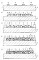 本発明はまた、発光装置の製造方法についても提供する。上述してきた本発明の発光装置は、その製造方法については特に制限されるものではないが、本発明の発光装置の製造方法を適用することで好適に製造することができる。本発明の発光装置の製造方法は、絶縁基板上に配線パターンを形成する工程と、配線パターン間に発光素子を搭載する工程と、発光素子と配線パターンとを電気的に接続する工程と、貫通孔を有するシリコーンゴムシートを絶縁基板上に載置する工程と、シリコーンゴムシートの貫通孔内に、発光素子を封止する封止体を形成する工程とを基本的に含む。ここで、図11は、本発明の発光装置の製造方法の好ましい一例として、図1に示した発光装置1を製造する場合を段階的に示す図である。以下、図11を参照して、本発明の発光装置の製造方法について具体的に説明する。  The present invention also provides a method for manufacturing a light emitting device. The manufacturing method of the light emitting device of the present invention described above is not particularly limited, but can be preferably manufactured by applying the manufacturing method of the light emitting device of the present invention. A method of manufacturing a light emitting device according to the present invention includes a step of forming a wiring pattern on an insulating substrate, a step of mounting a light emitting element between the wiring patterns, a step of electrically connecting the light emitting element and the wiring pattern, and a penetration The method basically includes a step of placing the silicone rubber sheet having holes on the insulating substrate and a step of forming a sealing body for sealing the light emitting element in the through hole of the silicone rubber sheet. Here, FIG. 11 is a diagram showing step by step a case where the