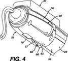 図3および図4は、ホルスター30の底部およびプローブの下部ケース52を示している。これらの図面に示されているように、プローブラッチ62は、プローブアセンブリ28をホルスター30に着脱可能に連結するためにプローブの下部ケース52内に向けて成形されている。プローブラッチ62は、片持ち梁であり、ラッチ傾斜面64に印加される力によって下方に撓み可能である。プローブラッチ62は、プローブアセンブリ28の近位端がホルスター30内に挿入されるときにホルスタースロット67内に挿入されるラッチ突出部66をさらに含む。ラッチ傾斜面64は、この傾斜面64とホルスター30のケースの内面65との間の相互作用によって下方に撓ませられている。プローブラッチ62は、プローブアセンブリ28が完全にホルスター30内に挿入されたときに、スロットキー68内に保持可能に嵌められる。ホルスター30からプローブアセンブリ28を取り外すために、操作者は、傾斜面64がスロットキー68から脱するまで、ラッチ突出部66を手動的に押し下げる。ラッチ突出部66は、その後に、プローブアセンブリ28およびホルスター30が分離されるまで、ホルスタースロット67を経由して軸方向に引かれてもよい。  3 and 4 show the bottom of the