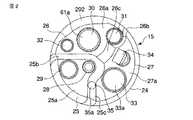 また、先端部15の円柱部材15aの8つ(第1〜第8)の孔部15a1〜15a8は、それぞれ先端カバー24の第1の撮像ユニット28、第1の照明窓29、第2の撮像ユニット30、第2の照明窓31、第3の照明窓32、処置具挿通チャンネル33の先端開口部33a、送気送水ノズル34、前方送水用の開口部35aと対応する位置に設けられている。そして、第1の孔部15a1には第1の撮像ユニット28の構成要素、第2の孔部15a2には第1の照明窓29の構成要素、第3の孔部15a3には第2の撮像ユニット30の構成要素、第4の孔部15a4には第2の照明窓31の構成要素、第5の孔部15a5には第3の照明窓32の構成要素、第6の孔部15a6には処置具挿通チャンネル33の管路の構成要素、第7の孔部15a7には送気送水ノズル34用の管路の構成要素、第8の孔部15a8には前方送水用の開口部35aに連通する管路の構成要素がそれぞれ後述する通り組み込まれている。  Further, the eight (first to eighth) hole portions 15a1 to 15a8 of the